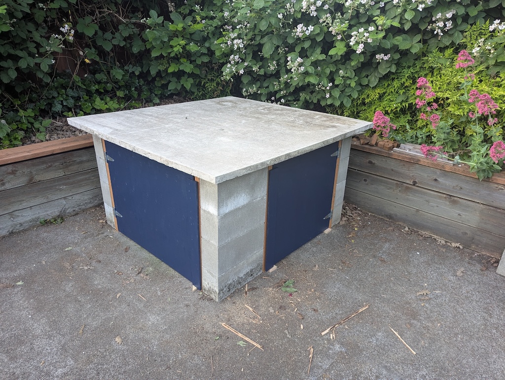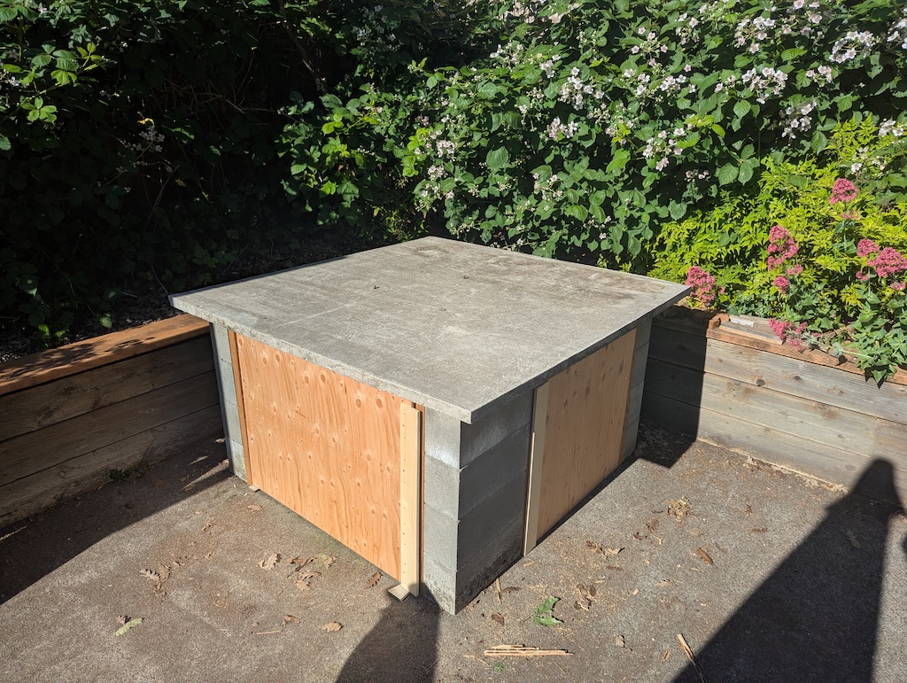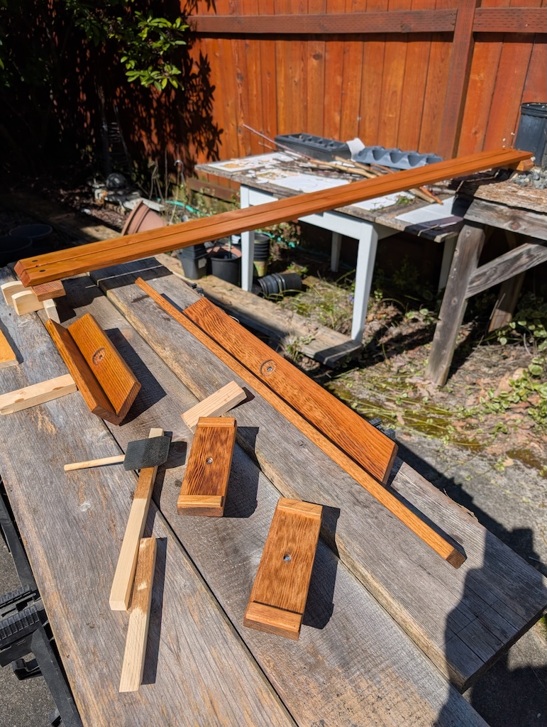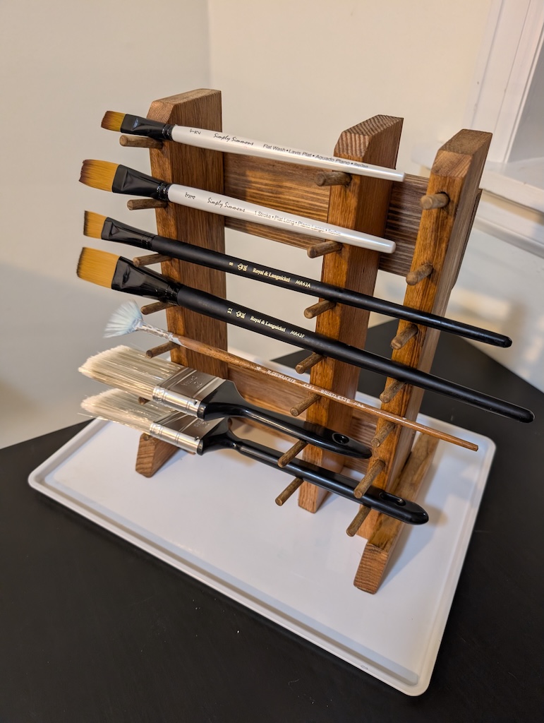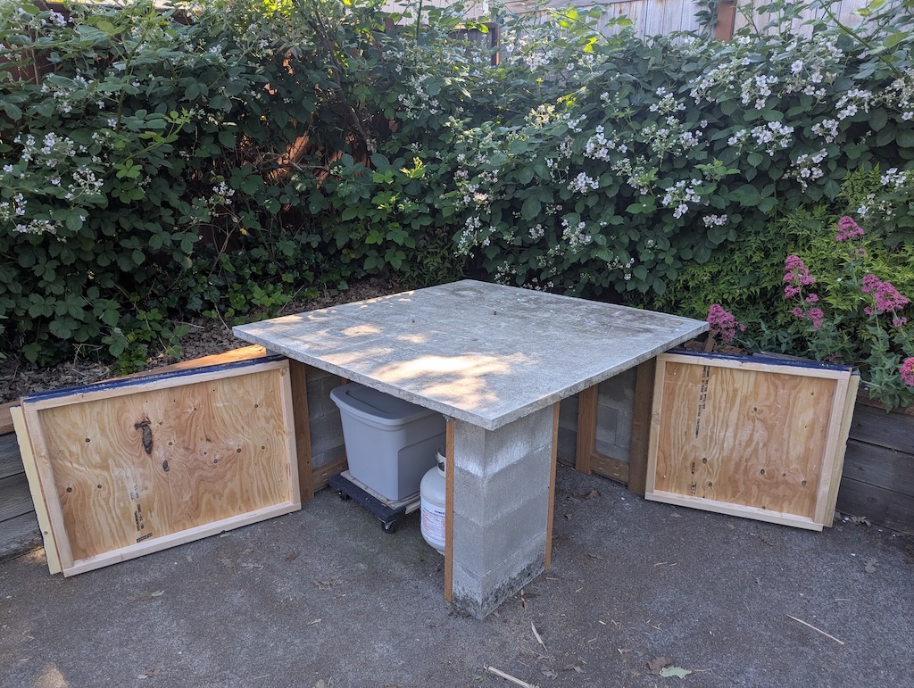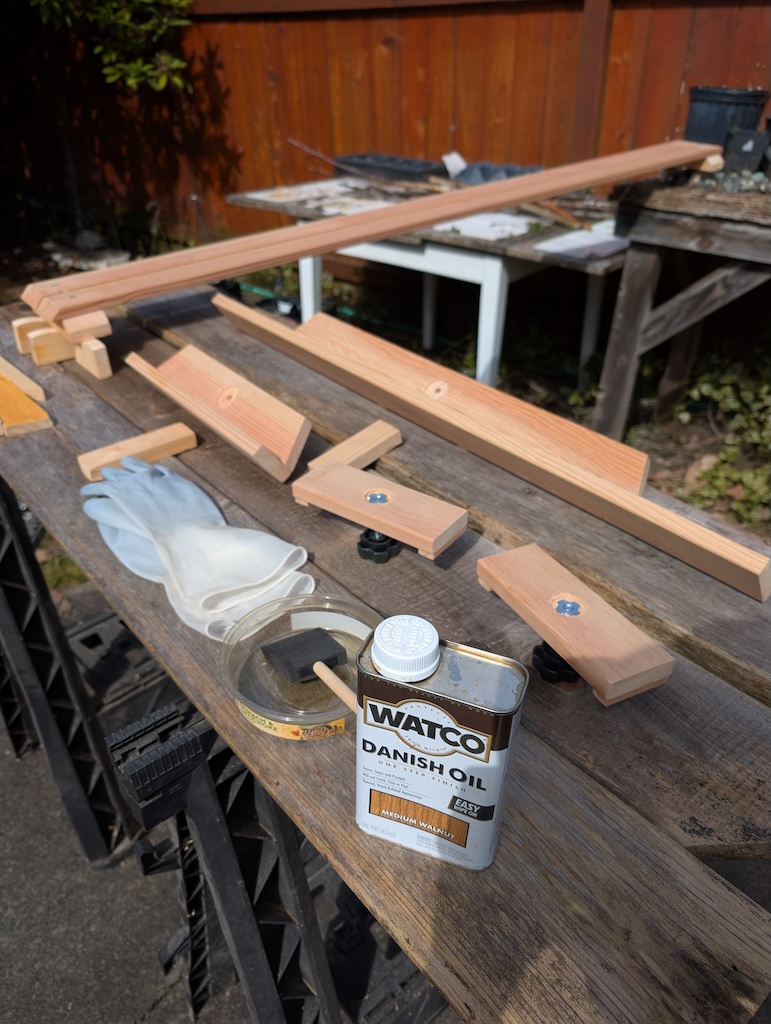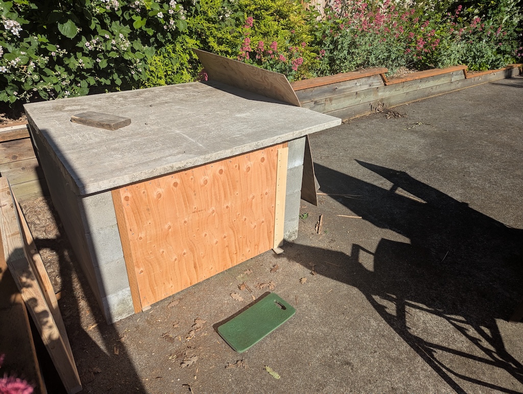 A lot of the items on this webpage started out on the Graphic Art page and then I split them out over here and grouped them with other "built" things. It's an imprecise distinction between things that are purely constructed and things that are an artistic endeavour. Art studio adjustable light fixturePainters want to avoid having the light source cast hand or brush shadows on the canvas, or reflect a glare into their eyes off the canvas. This light fixture, built around an LED light strip cut into four sections, enables me to move the light forward and backward, as well as adjust its tilt relative to the canvas. Brush holderPaint brushes are best dried horizontal and artists often use multiple brushes at once, so it is helpful to have a place to quickly store and retrieve them. Wall easelMost people are familiar with conventional painting easels, tripods or four-legged contraptions that hold a canvas in a vertical or tilted orientation at a desired height for a painter. However, when working on larger canvases in interior studios (as opposed to plein air painting outside), artists often rely on a wall easel, which rather than free-standing, is a rigid structure mounted on a wall. There are several variations on this theme, such as French cleats and such, but one of the most common designs replicates the most common plein air design of a vertical track with sliding horizontal ledges. That is the kind I built. Raised garden bed64-square foot (4'x16'), standing hight, raised garden bed, fully enclosed with chicken wire and bird netting. Second pizza ovenAfter selling the house with the previous pizza oven (also shown below on this page), I started building a second pizza oven at my next house. As of this writing, I have only built the stand and the hearth, essentially a concrete table. I currently use it as the work area for a propane pizza oven but I fully designed, and purchased materials and tools for, a new pizza oven. This one, if I ever build it, will be made of cast refractory concrete instead of individual bricks, but will function in exact the same way, wood-fired — although I have a notion of configuring it to pre-fire (warm up) with gas, switching to a wood fire when actually cooking. Or perhaps I'll never build it. Who knows? Walnut double-window sill with alder casingFor my bathroom remodel, I did a lot of finishing work myself, such as the window casing in my daughter's new bedroom. Walnut window sill with birdseye maple casingFor my bathroom remodel, I did a lot of finishing work myself, such as the window casing in the new nook of the master bedroom. Quartzite window sill with tile casingFor my bathroom remodel, I did a lot of finishing work myself, such as one of the windows in the bathroom. Ceiling beam mouldingFor my bathroom remodel, I did a lot of finishing work myself, such as the moulding on this new support beam that protrudes through the dining room ceiling. Door mouldingFor my bathroom remodel, I did a lot of finishing work myself, such as eight door mouldings (each side of four new doors), consisting of Douglas Fir cut with nifty miter angles along the top and attached with rustic looking square-drive black oxide screws. Bathroom vanitiesFor my bathroom remodel, I did a lot of finishing work myself. I chose to build two bathroom vanities from scratch rather than purchase stock vanities, partly to meet eccentric size preferences that couldn't be had off the shelf, partly to save money, partly to satisfy my picky aesthetics, which I found difficult to achieve shopping around, and partly just for fun. Outdoor workbenchI needed a place to potted plants before bringing them indoors or to do various yard work (mostly plants again, the occasional gutter repair, etc.) and I was tired of kneeling on the ground for such work, so I built this bad boy. I don't have a final photo, but I cut the top pieces to fit the frame before screwing them down. Three shed doorsWhen I bought my house, the shed had three doorways, but no doors at all. So I built some. Catio and window cat doorI built my cat a catio with a window cat door, to which I later attached an IMU-enabled microcontroller with wifi to data-collect the timings of his exits and reentries. A few years after building it, just after having the house roof replaced during the bathroom remodel, I used some leftover shingle to put a proper shingle roof over the cedar roof. I don't have a photo of that. I also don't have a photo of the electronics for detecting door events. Workbench #2When I sold my previous house, I left the workbench I built (see further below) in the basement and built a new one at my next house, shown here (with one of the shed doors under construction on top of the bench). Patinated copper sheet back plates for bedroom furnitureI added patinated copper sheet back plates to my Mexican solid wood bedroom furniture set. The pieces are attached with copper nails and the wrought iron handles were removed and then replaced after attaching the copper backing. Talavera stair risersI made the talavera stair risers for our house extension. Stair railingI built the stair railing for our house extension (the contractor put in the newel post but I made the top and bottom rails and the balusters). The balusters are 3/4" copper pipe with an accelerated patina. The pipe was left over from the deck railing balusters that had been removed for the extension. Etching and copper-dial mechanical watchesI built an electro-etching tool (little more than a power supply. Here are my initial experiments. My etching artwork has consisted of copper watch dials for my microbrand mechanical watches (Badlands Watches). Please visit the Badlands website to see more photos. Wood-fired brick pizza ovenThis project was such an enormous undertaking that it has its own webpage. Please go there to see the full history of the project, including numerous photos of the construction process. My ex-wife's engagement ring and our wedding bandsBoth 