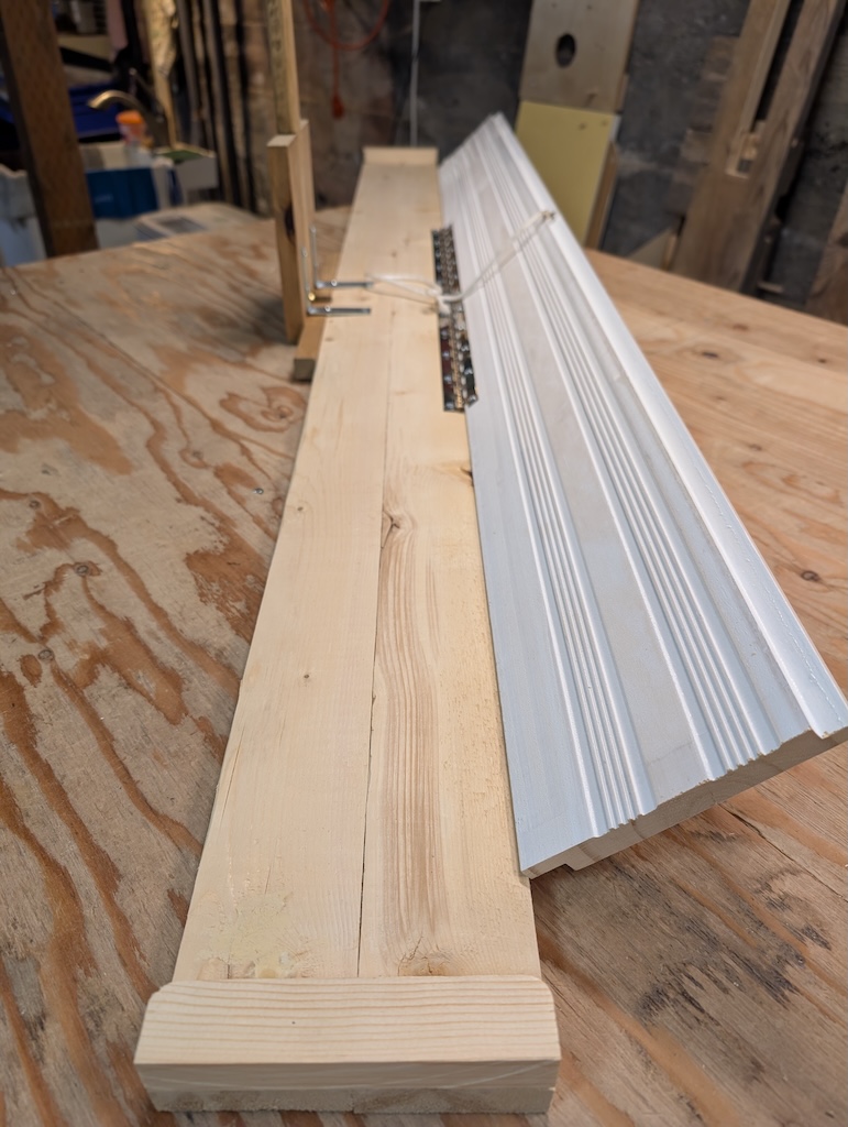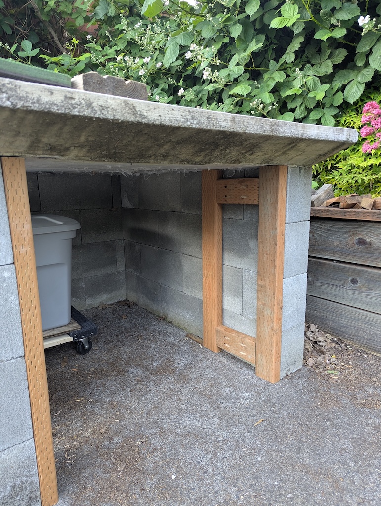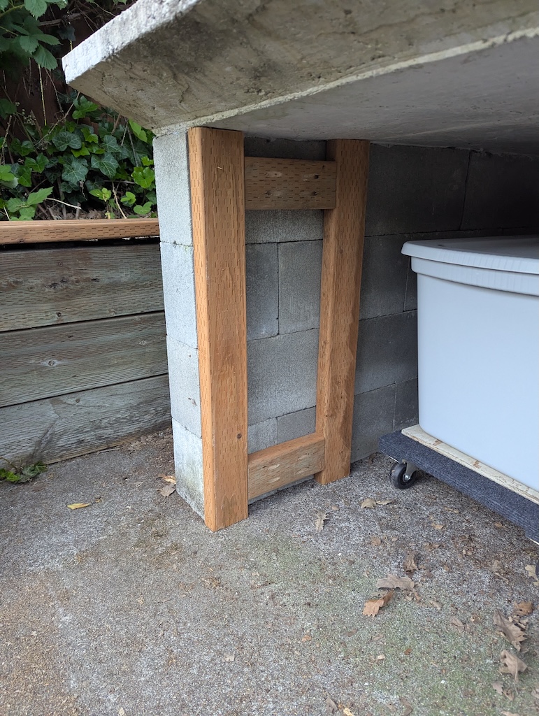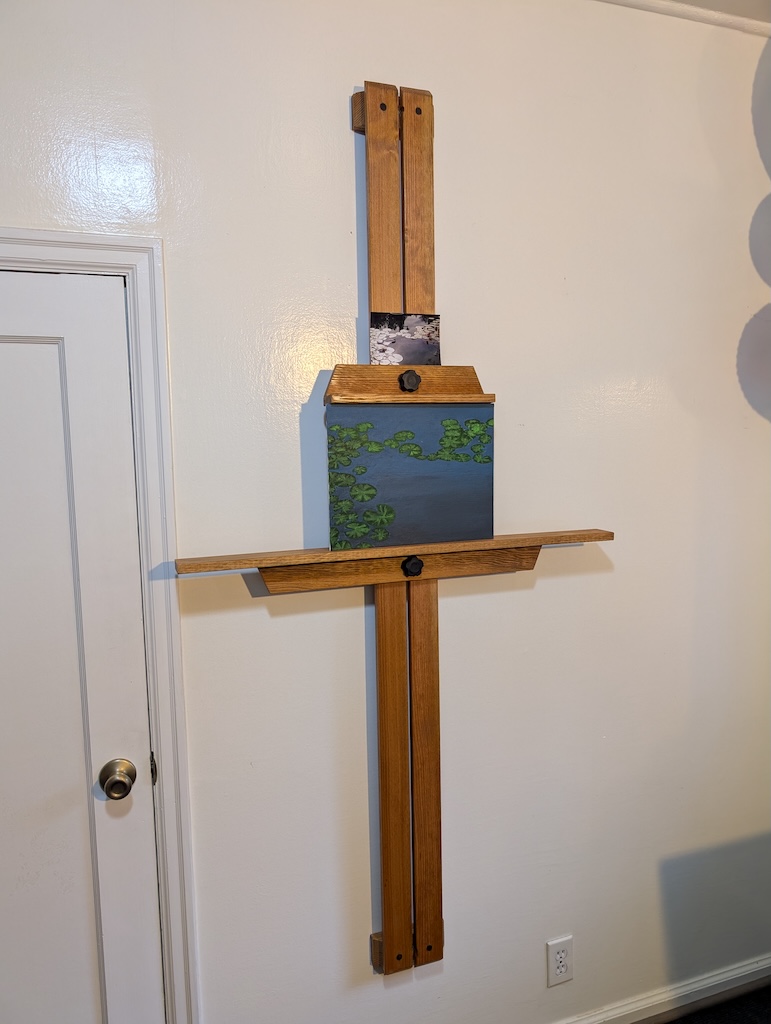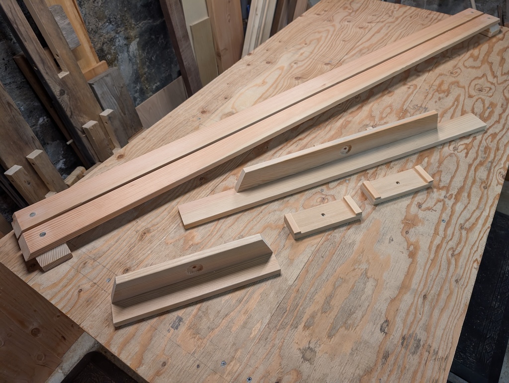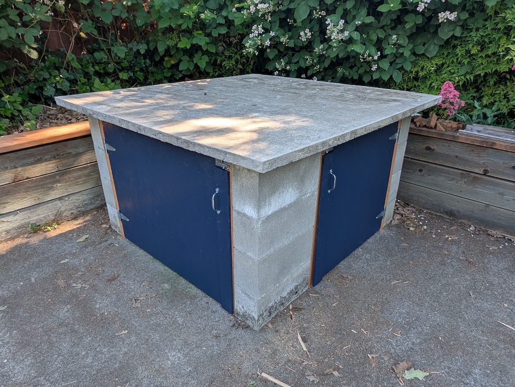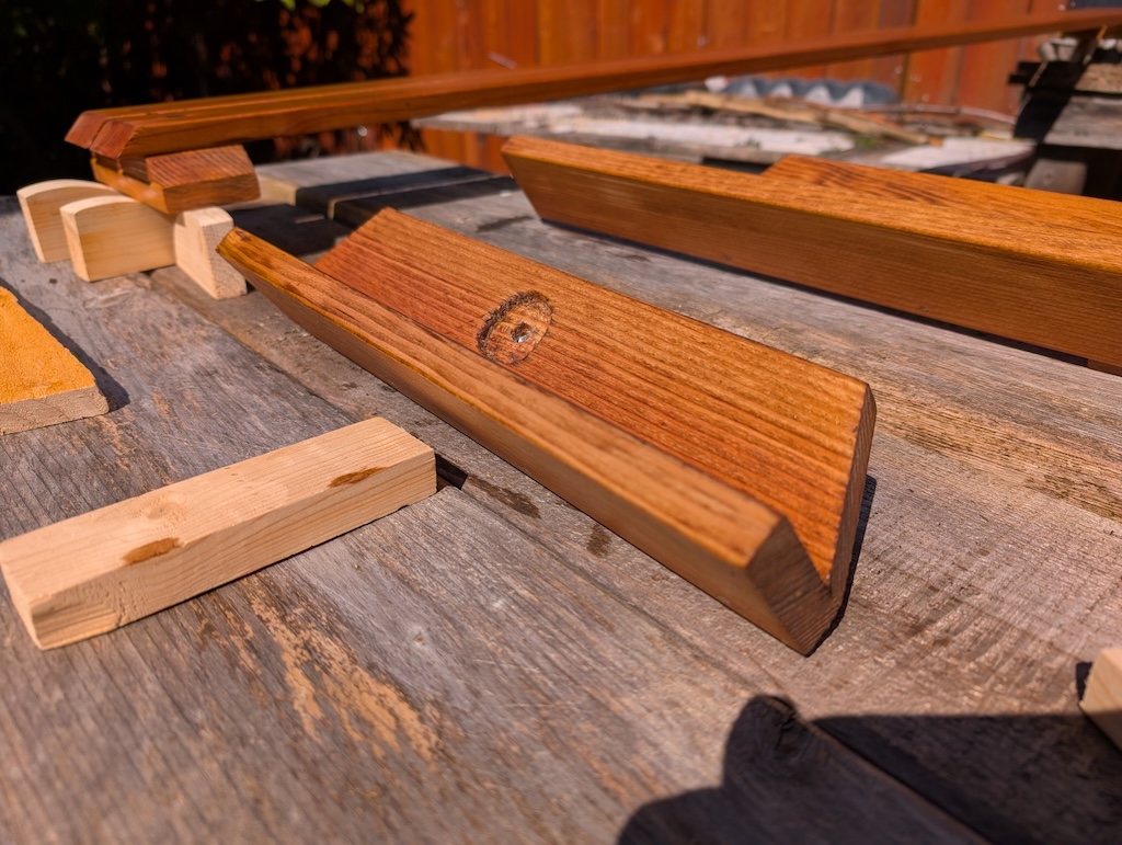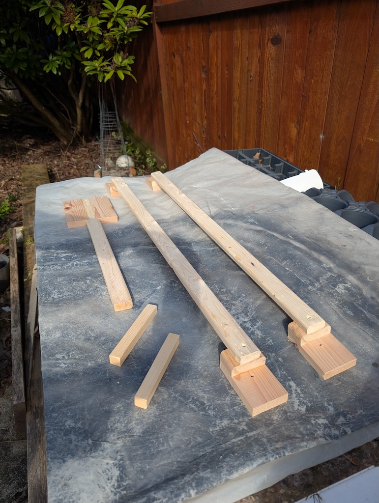 A lot of the items on this webpage started out on the Graphic Art page and then I split them out over here and grouped them with other "built" things. It's an imprecise distinction between things that are purely constructed and things that are an artistic endeavour. Art studio adjustable light fixturePainters want to avoid having the light source cast hand or brush shadows on the canvas, or reflect a glare into their eyes off the canvas. This light fixture, built around an LED light strip cut into four sections, enables me to move the light forward and backward, as well as adjust its tilt relative to the canvas. Brush holderPaint brushes are best dried horizontal and artists often use multiple brushes at once, so it is helpful to have a place to quickly store and retrieve them. Wall easelMost people are familiar with conventional painting easels, tripods or four-legged contraptions that hold a canvas in a vertical or tilted orientation at a desired height for a painter. However, when working on larger canvases in interior studios (as opposed to plein air painting outside), artists often rely on a wall easel, which rather than free-standing, is a rigid structure mounted on a wall. There are several variations on this theme, such as French cleats and such, but one of the most common designs replicates the most common plein air design of a vertical track with sliding horizontal ledges. That is the kind I built. Raised garden bed64-square foot (4'x16'), standing hight, raised garden bed, fully enclosed with chicken wire and bird netting. Second pizza ovenAfter selling the house with the previous pizza oven (also shown below on this page), I started building a second pizza oven at my next house. As of this writing, I have only built the stand and the hearth, essentially a concrete table. I currently use it as the work area for a propane pizza oven but I fully designed, and purchased materials and tools for, a new pizza oven. This one, if I ever build it, will be made of cast refractory concrete instead of individual bricks, but will function in exact the same way, wood-fired — although I have a notion of configuring it to pre-fire (warm up) with gas, switching to a wood fire when actually cooking. Or perhaps I'll never build it. Who knows? Walnut double-window sill with alder casingFor my bathroom remodel, I did a lot of finishing work myself, such as the window casing in my daughter's new bedroom. Walnut window sill with birdseye maple casingFor my bathroom remodel, I did a lot of finishing work myself, such as the window casing in the new nook of the master bedroom. Quartzite window sill with tile casingFor my bathroom remodel, I did a lot of finishing work myself, such as one of the windows in the bathroom. Ceiling beam mouldingFor my bathroom remodel, I did a lot of finishing work myself, such as the moulding on this new support beam that protrudes through the dining room ceiling. Door mouldingFor my bathroom remodel, I did a lot of finishing work myself, such as eight door mouldings (each side of four new doors), consisting of Douglas Fir cut with nifty miter angles along the top and attached with rustic looking square-drive black oxide screws. Bathroom vanitiesFor my bathroom remodel, I did a lot of finishing work myself. I chose to build two bathroom vanities from scratch rather than purchase stock vanities, partly to meet eccentric size preferences that couldn't be had off the shelf, partly to save money, partly to satisfy my picky aesthetics, which I found difficult to achieve shopping around, and partly just for fun. Outdoor workbenchI needed a place to potted plants before bringing them indoors or to do various yard work (mostly plants again, the occasional gutter repair, etc.) and I was tired of kneeling on the ground for such work, so I built this bad boy. I don't have a final photo, but I cut the top pieces to fit the frame before screwing them down. Three shed doorsWhen I bought my house, the shed had three doorways, but no doors at all. So I built some. Catio and window cat doorI built my cat a catio with a window cat door, to which I later attached an IMU-enabled microcontroller with wifi to data-collect the timings of his exits and reentries. A few years after building it, just after having the house roof replaced during the bathroom remodel, I used some leftover shingle to put a proper shingle roof over the cedar roof. I don't have a photo of that. I also don't have a photo of the electronics for detecting door events. Workbench #2When I sold my previous house, I left the workbench I built (see further below) in the basement and built a new one at my next house, shown here (with one of the shed doors under construction on top of the bench). Patinated copper sheet back plates for bedroom furnitureI added patinated copper sheet back plates to my Mexican solid wood bedroom furniture set. The pieces are attached with copper nails and the wrought iron handles were removed and then replaced after attaching the copper backing. Talavera stair risersI made the talavera stair risers for our house extension. Stair railingI built the stair railing for our house extension (the contractor put in the newel post but I made the top and bottom rails and the balusters). The balusters are 3/4" copper pipe with an accelerated patina. The pipe was left over from the deck railing balusters that had been removed for the extension. Etching and copper-dial mechanical watchesI built an electro-etching tool (little more than a power supply. Here are my initial experiments. My etching artwork has consisted of copper watch dials for my microbrand mechanical watches (Badlands Watches). Please visit the Badlands website to see more photos. Wood-fired brick pizza ovenThis project was such an enormous undertaking that it has its own webpage. Please go there to see the full history of the project, including numerous photos of the construction process. My ex-wife's engagement ring and our wedding bandsBoth 