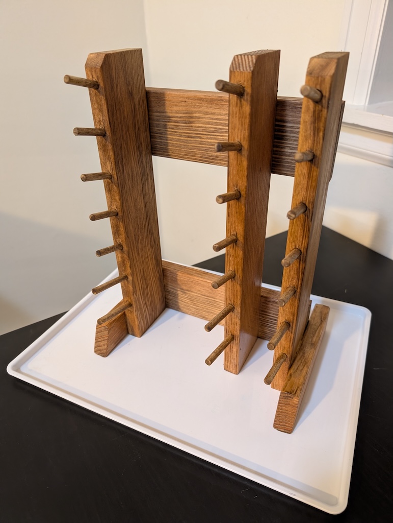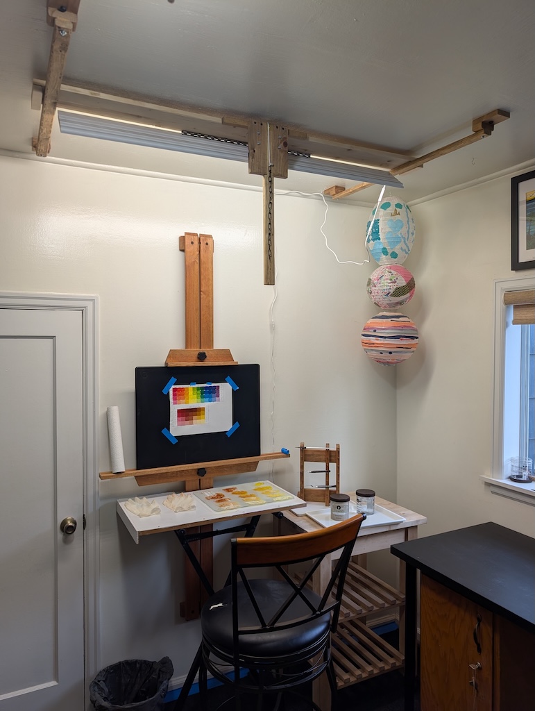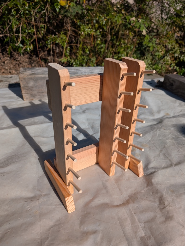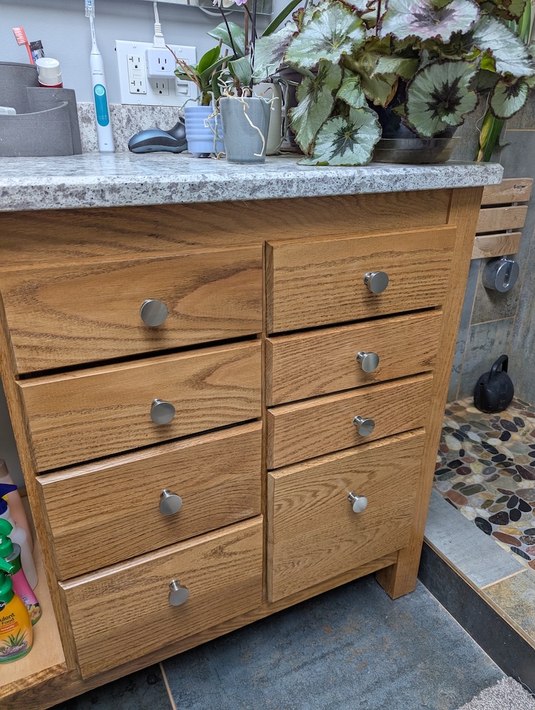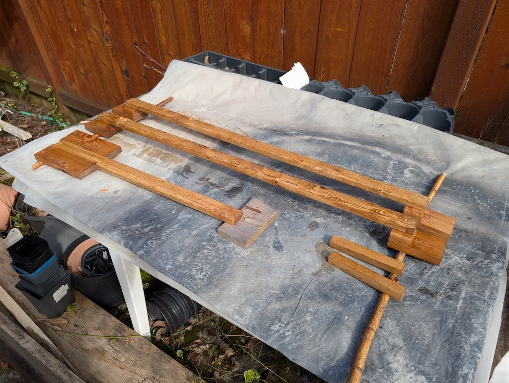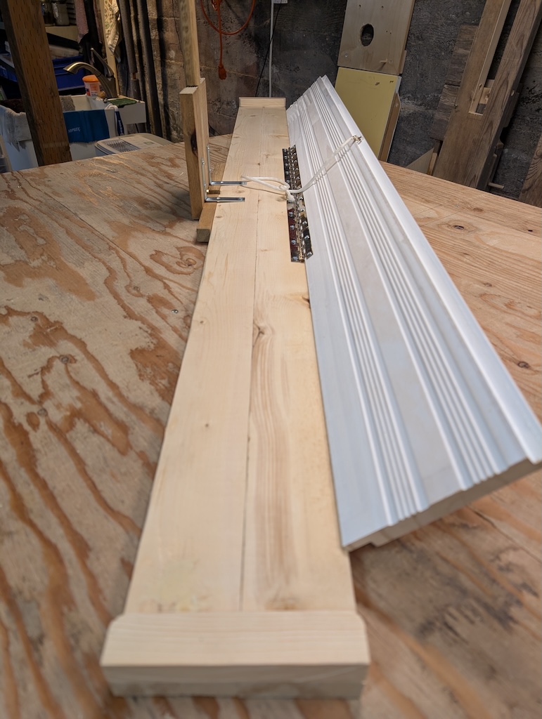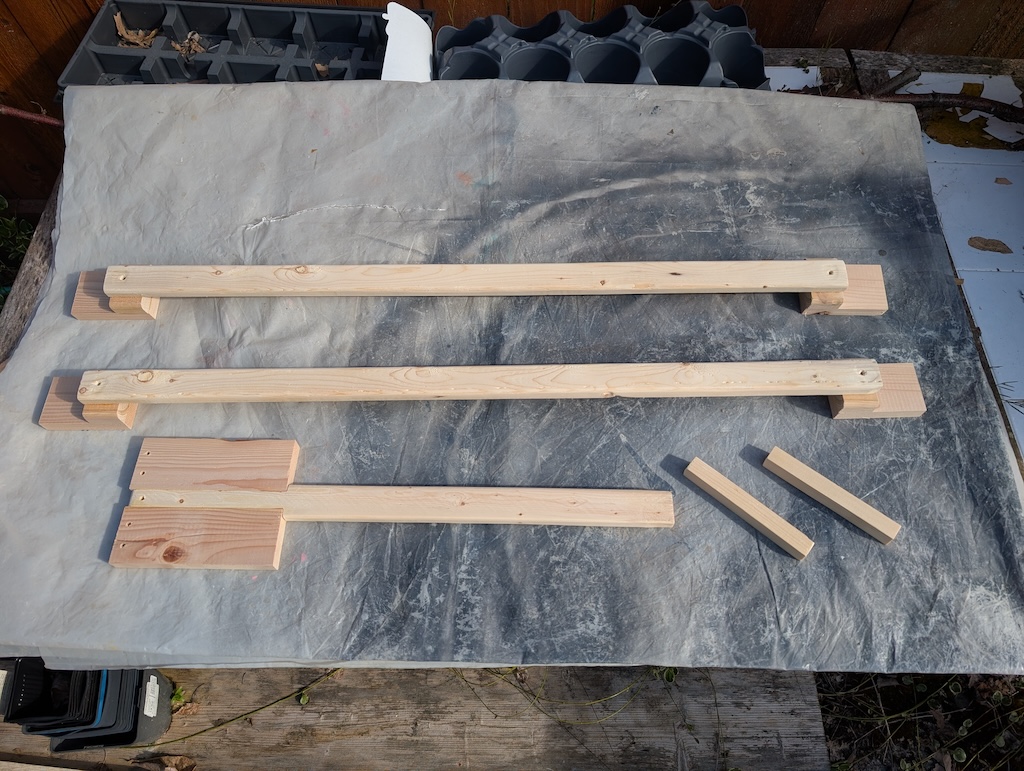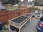 A lot of the items on this webpage started out on the Graphic Art page and then I split them out over here and grouped them with other "built" things. It's an imprecise distinction between things that are purely constructed and things that are an artistic endeavour. Art studio adjustable light fixturePainters want to avoid having the light source cast hand or brush shadows on the canvas, or reflect a glare into their eyes off the canvas. This light fixture, built around an LED light strip cut into four sections, enables me to move the light forward and backward, as well as adjust its tilt relative to the canvas. Brush holderPaint brushes are best dried horizontal and artists often use multiple brushes at once, so it is helpful to have a place to quickly store and retrieve them. Wall easelMost people are familiar with conventional painting easels, tripods or four-legged contraptions that hold a canvas in a vertical or tilted orientation at a desired height for a painter. However, when working on larger canvases in interior studios (as opposed to plein air painting outside), artists often rely on a wall easel, which rather than free-standing, is a rigid structure mounted on a wall. There are several variations on this theme, such as French cleats and such, but one of the most common designs replicates the most common plein air design of a vertical track with sliding horizontal ledges. That is the kind I built. Raised garden bed64-square foot (4'x16'), standing hight, raised garden bed, fully enclosed with chicken wire and bird netting. Second pizza ovenAfter selling the house with the previous pizza oven (also shown below on this page), I started building a second pizza oven at my next house. As of this writing, I have only built the stand and the hearth, essentially a concrete table. I currently use it as the work area for a propane pizza oven but I fully designed, and purchased materials and tools for, a new pizza oven. This one, if I ever build it, will be made of cast refractory concrete instead of individual bricks, but will function in exact the same way, wood-fired — although I have a notion of configuring it to pre-fire (warm up) with gas, switching to a wood fire when actually cooking. Or perhaps I'll never build it. Who knows? Walnut double-window sill with alder casingFor my bathroom remodel, I did a lot of finishing work myself, such as the window casing in my daughter's new bedroom. Walnut window sill with birdseye maple casingFor my bathroom remodel, I did a lot of finishing work myself, such as the window casing in the new nook of the master bedroom. Quartzite window sill with tile casingFor my bathroom remodel, I did a lot of finishing work myself, such as one of the windows in the bathroom. Ceiling beam mouldingFor my bathroom remodel, I did a lot of finishing work myself, such as the moulding on this new support beam that protrudes through the dining room ceiling. Door mouldingFor my bathroom remodel, I did a lot of finishing work myself, such as eight door mouldings (each side of four new doors), consisting of Douglas Fir cut with nifty miter angles along the top and attached with rustic looking square-drive black oxide screws. Bathroom vanitiesFor my bathroom remodel, I did a lot of finishing work myself. I chose to build two bathroom vanities from scratch rather than purchase stock vanities, partly to meet eccentric size preferences that couldn't be had off the shelf, partly to save money, partly to satisfy my picky aesthetics, which I found difficult to achieve shopping around, and partly just for fun. Outdoor workbenchI needed a place to potted plants before bringing them indoors or to do various yard work (mostly plants again, the occasional gutter repair, etc.) and I was tired of kneeling on the ground for such work, so I built this bad boy. I don't have a final photo, but I cut the top pieces to fit the frame before screwing them down. Three shed doorsWhen I bought my house, the shed had three doorways, but no doors at all. So I built some. Catio and window cat doorI built my cat a catio with a window cat door, to which I later attached an IMU-enabled microcontroller with wifi to data-collect the timings of his exits and reentries. A few years after building it, just after having the house roof replaced during the bathroom remodel, I used some leftover shingle to put a proper shingle roof over the cedar roof. I don't have a photo of that. I also don't have a photo of the electronics for detecting door events. Workbench #2When I sold my previous house, I left the workbench I built (see further below) in the basement and built a new one at my next house, shown here (with one of the shed doors under construction on top of the bench). Patinated copper sheet back plates for bedroom furnitureI added patinated copper sheet back plates to my Mexican solid wood bedroom furniture set. The pieces are attached with copper nails and the wrought iron handles were removed and then replaced after attaching the copper backing. Talavera stair risersI made the talavera stair risers for our house extension. Stair railingI built the stair railing for our house extension (the contractor put in the newel post but I made the top and bottom rails and the balusters). The balusters are 3/4" copper pipe with an accelerated patina. The pipe was left over from the deck railing balusters that had been removed for the extension. Etching and copper-dial mechanical watchesI built an electro-etching tool (little more than a power supply. Here are my initial experiments. My etching artwork has consisted of copper watch dials for my microbrand mechanical watches (Badlands Watches). Please visit the Badlands website to see more photos. Wood-fired brick pizza ovenThis project was such an enormous undertaking that it has its own webpage. Please go there to see the full history of the project, including numerous photos of the construction process. My ex-wife's engagement ring and our wedding bandsBoth 