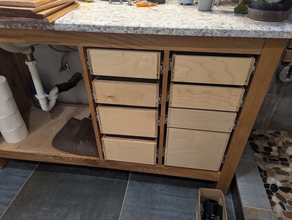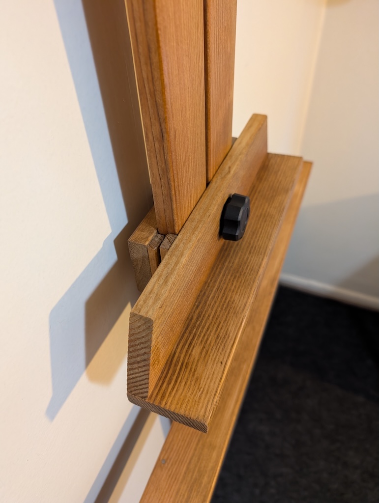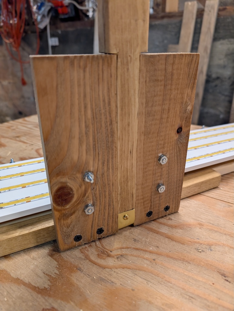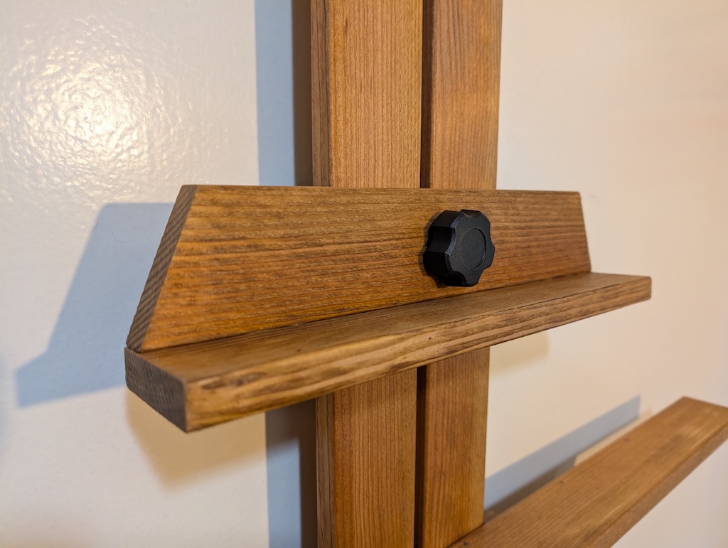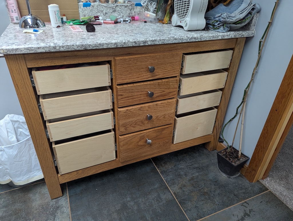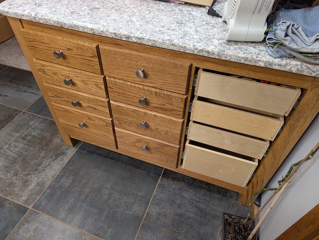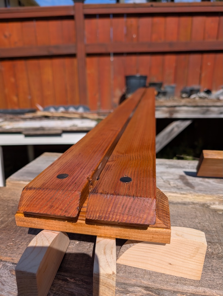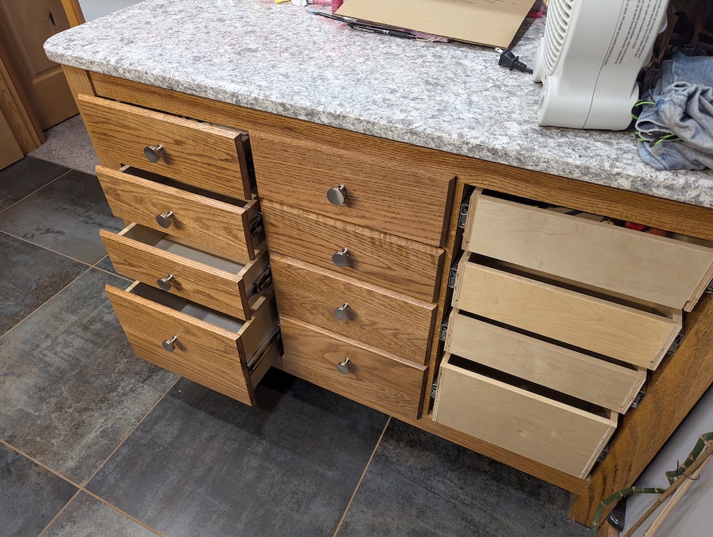 A lot of the items on this webpage started out on the Graphic Art page and then I split them out over here and grouped them with other "built" things. It's an imprecise distinction between things that are purely constructed and things that are an artistic endeavour. Art studio adjustable light fixturePainters want to avoid having the light source cast hand or brush shadows on the canvas, or reflect a glare into their eyes off the canvas. This light fixture, built around an LED light strip cut into four sections, enables me to move the light forward and backward, as well as adjust its tilt relative to the canvas. Brush holderPaint brushes are best dried horizontal and artists often use multiple brushes at once, so it is helpful to have a place to quickly store and retrieve them. Wall easelMost people are familiar with conventional painting easels, tripods or four-legged contraptions that hold a canvas in a vertical or tilted orientation at a desired height for a painter. However, when working on larger canvases in interior studios (as opposed to plein air painting outside), artists often rely on a wall easel, which rather than free-standing, is a rigid structure mounted on a wall. There are several variations on this theme, such as French cleats and such, but one of the most common designs replicates the most common plein air design of a vertical track with sliding horizontal ledges. That is the kind I built. Raised garden bed64-square foot (4'x16'), standing hight, raised garden bed, fully enclosed with chicken wire and bird netting. Second pizza ovenAfter selling the house with the previous pizza oven (also shown below on this page), I started building a second pizza oven at my next house. As of this writing, I have only built the stand and the hearth, essentially a concrete table. I currently use it as the work area for a propane pizza oven but I fully designed, and purchased materials and tools for, a new pizza oven. This one, if I ever build it, will be made of cast refractory concrete instead of individual bricks, but will function in exact the same way, wood-fired — although I have a notion of configuring it to pre-fire (warm up) with gas, switching to a wood fire when actually cooking. Or perhaps I'll never build it. Who knows? Walnut double-window sill with alder casingFor my bathroom remodel, I did a lot of finishing work myself, such as the window casing in my daughter's new bedroom. Walnut window sill with birdseye maple casingFor my bathroom remodel, I did a lot of finishing work myself, such as the window casing in the new nook of the master bedroom. Quartzite window sill with tile casingFor my bathroom remodel, I did a lot of finishing work myself, such as one of the windows in the bathroom. Ceiling beam mouldingFor my bathroom remodel, I did a lot of finishing work myself, such as the moulding on this new support beam that protrudes through the dining room ceiling. Door mouldingFor my bathroom remodel, I did a lot of finishing work myself, such as eight door mouldings (each side of four new doors), consisting of Douglas Fir cut with nifty miter angles along the top and attached with rustic looking square-drive black oxide screws. Bathroom vanitiesFor my bathroom remodel, I did a lot of finishing work myself. I chose to build two bathroom vanities from scratch rather than purchase stock vanities, partly to meet eccentric size preferences that couldn't be had off the shelf, partly to save money, partly to satisfy my picky aesthetics, which I found difficult to achieve shopping around, and partly just for fun. Outdoor workbenchI needed a place to potted plants before bringing them indoors or to do various yard work (mostly plants again, the occasional gutter repair, etc.) and I was tired of kneeling on the ground for such work, so I built this bad boy. I don't have a final photo, but I cut the top pieces to fit the frame before screwing them down. Three shed doorsWhen I bought my house, the shed had three doorways, but no doors at all. So I built some. Catio and window cat doorI built my cat a catio with a window cat door, to which I later attached an IMU-enabled microcontroller with wifi to data-collect the timings of his exits and reentries. A few years after building it, just after having the house roof replaced during the bathroom remodel, I used some leftover shingle to put a proper shingle roof over the cedar roof. I don't have a photo of that. I also don't have a photo of the electronics for detecting door events. Workbench #2When I sold my previous house, I left the workbench I built (see further below) in the basement and built a new one at my next house, shown here (with one of the shed doors under construction on top of the bench). Patinated copper sheet back plates for bedroom furnitureI added patinated copper sheet back plates to my Mexican solid wood bedroom furniture set. The pieces are attached with copper nails and the wrought iron handles were removed and then replaced after attaching the copper backing. Talavera stair risersI made the talavera stair risers for our house extension. Stair railingI built the stair railing for our house extension (the contractor put in the newel post but I made the top and bottom rails and the balusters). The balusters are 3/4" copper pipe with an accelerated patina. The pipe was left over from the deck railing balusters that had been removed for the extension. Etching and copper-dial mechanical watchesI built an electro-etching tool (little more than a power supply. Here are my initial experiments. My etching artwork has consisted of copper watch dials for my microbrand mechanical watches (Badlands Watches). Please visit the Badlands website to see more photos. Wood-fired brick pizza ovenThis project was such an enormous undertaking that it has its own webpage. Please go there to see the full history of the project, including numerous photos of the construction process. My ex-wife's engagement ring and our wedding bandsBoth 