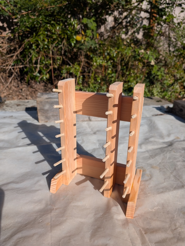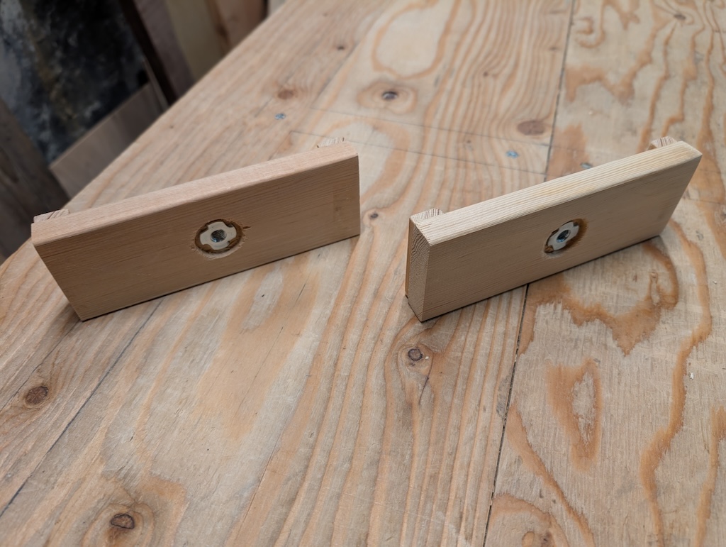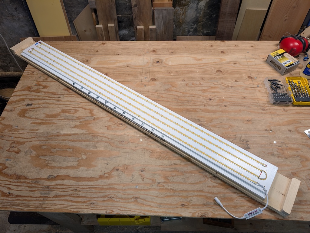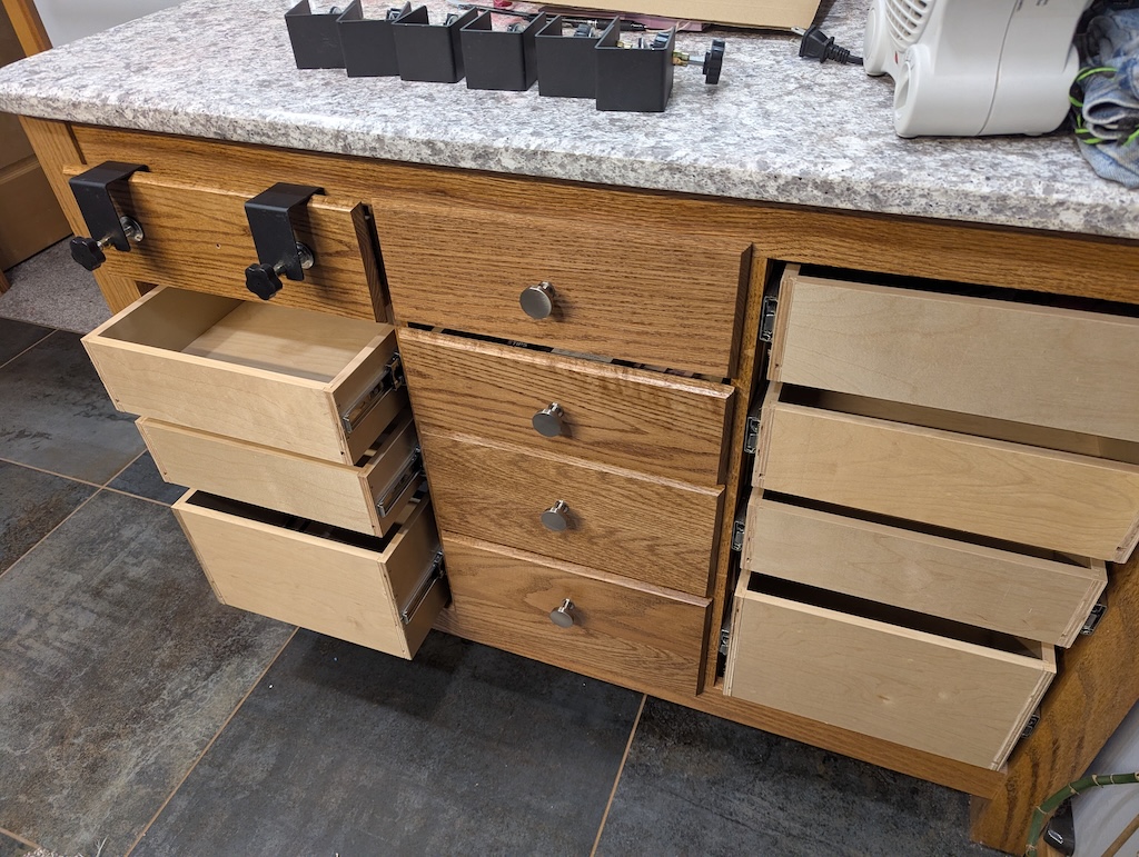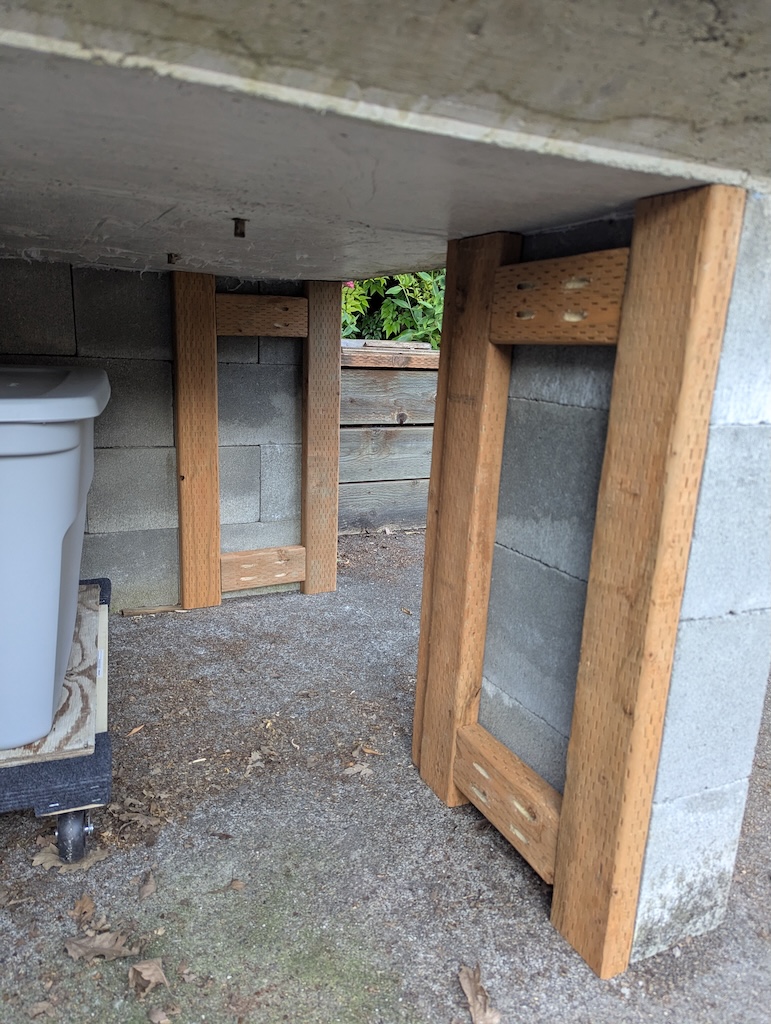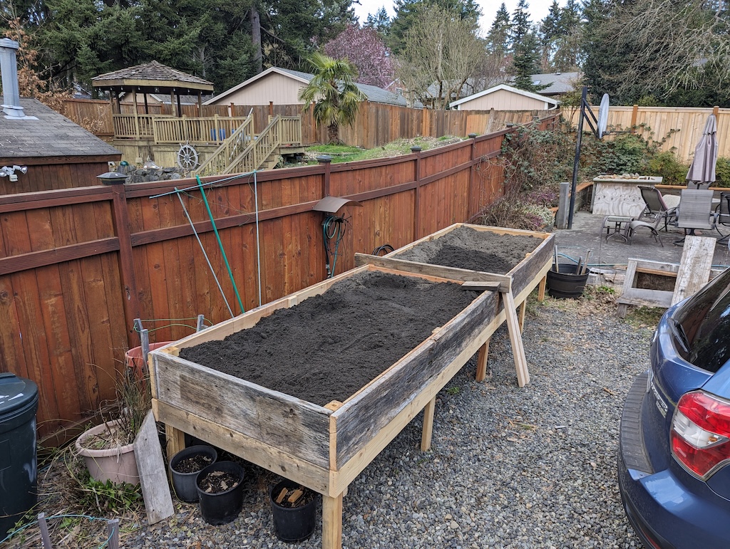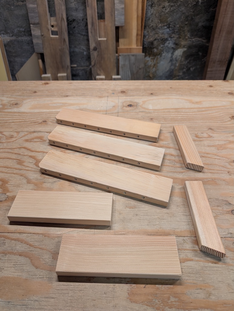 A lot of the items on this webpage started out on the Graphic Art page and then I split them out over here and grouped them with other "built" things. It's an imprecise distinction between things that are purely constructed and things that are an artistic endeavour. Art studio adjustable light fixturePainters want to avoid having the light source cast hand or brush shadows on the canvas, or reflect a glare into their eyes off the canvas. This light fixture, built around an LED light strip cut into four sections, enables me to move the light forward and backward, as well as adjust its tilt relative to the canvas. Brush holderPaint brushes are best dried horizontal and artists often use multiple brushes at once, so it is helpful to have a place to quickly store and retrieve them. Wall easelMost people are familiar with conventional painting easels, tripods or four-legged contraptions that hold a canvas in a vertical or tilted orientation at a desired height for a painter. However, when working on larger canvases in interior studios (as opposed to plein air painting outside), artists often rely on a wall easel, which rather than free-standing, is a rigid structure mounted on a wall. There are several variations on this theme, such as French cleats and such, but one of the most common designs replicates the most common plein air design of a vertical track with sliding horizontal ledges. That is the kind I built. Raised garden bed64-square foot (4'x16'), standing hight, raised garden bed, fully enclosed with chicken wire and bird netting. Second pizza ovenAfter selling the house with the previous pizza oven (also shown below on this page), I started building a second pizza oven at my next house. As of this writing, I have only built the stand and the hearth, essentially a concrete table. I currently use it as the work area for a propane pizza oven but I fully designed, and purchased materials and tools for, a new pizza oven. This one, if I ever build it, will be made of cast refractory concrete instead of individual bricks, but will function in exact the same way, wood-fired — although I have a notion of configuring it to pre-fire (warm up) with gas, switching to a wood fire when actually cooking. Or perhaps I'll never build it. Who knows? Walnut double-window sill with alder casingFor my bathroom remodel, I did a lot of finishing work myself, such as the window casing in my daughter's new bedroom. Walnut window sill with birdseye maple casingFor my bathroom remodel, I did a lot of finishing work myself, such as the window casing in the new nook of the master bedroom. Quartzite window sill with tile casingFor my bathroom remodel, I did a lot of finishing work myself, such as one of the windows in the bathroom. Ceiling beam mouldingFor my bathroom remodel, I did a lot of finishing work myself, such as the moulding on this new support beam that protrudes through the dining room ceiling. Door mouldingFor my bathroom remodel, I did a lot of finishing work myself, such as eight door mouldings (each side of four new doors), consisting of Douglas Fir cut with nifty miter angles along the top and attached with rustic looking square-drive black oxide screws. Bathroom vanitiesFor my bathroom remodel, I did a lot of finishing work myself. I chose to build two bathroom vanities from scratch rather than purchase stock vanities, partly to meet eccentric size preferences that couldn't be had off the shelf, partly to save money, partly to satisfy my picky aesthetics, which I found difficult to achieve shopping around, and partly just for fun. Outdoor workbenchI needed a place to potted plants before bringing them indoors or to do various yard work (mostly plants again, the occasional gutter repair, etc.) and I was tired of kneeling on the ground for such work, so I built this bad boy. I don't have a final photo, but I cut the top pieces to fit the frame before screwing them down. Three shed doorsWhen I bought my house, the shed had three doorways, but no doors at all. So I built some. Catio and window cat doorI built my cat a catio with a window cat door, to which I later attached an IMU-enabled microcontroller with wifi to data-collect the timings of his exits and reentries. A few years after building it, just after having the house roof replaced during the bathroom remodel, I used some leftover shingle to put a proper shingle roof over the cedar roof. I don't have a photo of that. I also don't have a photo of the electronics for detecting door events. Workbench #2When I sold my previous house, I left the workbench I built (see further below) in the basement and built a new one at my next house, shown here (with one of the shed doors under construction on top of the bench). Patinated copper sheet back plates for bedroom furnitureI added patinated copper sheet back plates to my Mexican solid wood bedroom furniture set. The pieces are attached with copper nails and the wrought iron handles were removed and then replaced after attaching the copper backing. Talavera stair risersI made the talavera stair risers for our house extension. Stair railingI built the stair railing for our house extension (the contractor put in the newel post but I made the top and bottom rails and the balusters). The balusters are 3/4" copper pipe with an accelerated patina. The pipe was left over from the deck railing balusters that had been removed for the extension. Etching and copper-dial mechanical watchesI built an electro-etching tool (little more than a power supply. Here are my initial experiments. My etching artwork has consisted of copper watch dials for my microbrand mechanical watches (Badlands Watches). Please visit the Badlands website to see more photos. Wood-fired brick pizza ovenThis project was such an enormous undertaking that it has its own webpage. Please go there to see the full history of the project, including numerous photos of the construction process. My ex-wife's engagement ring and our wedding bandsBoth 