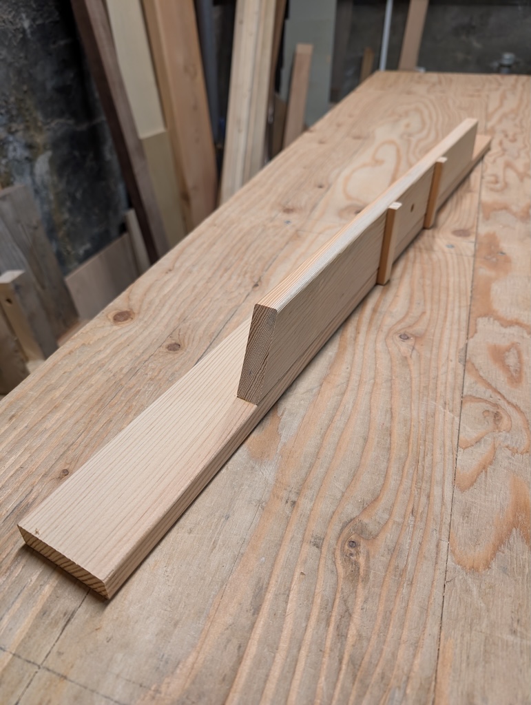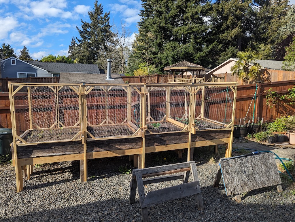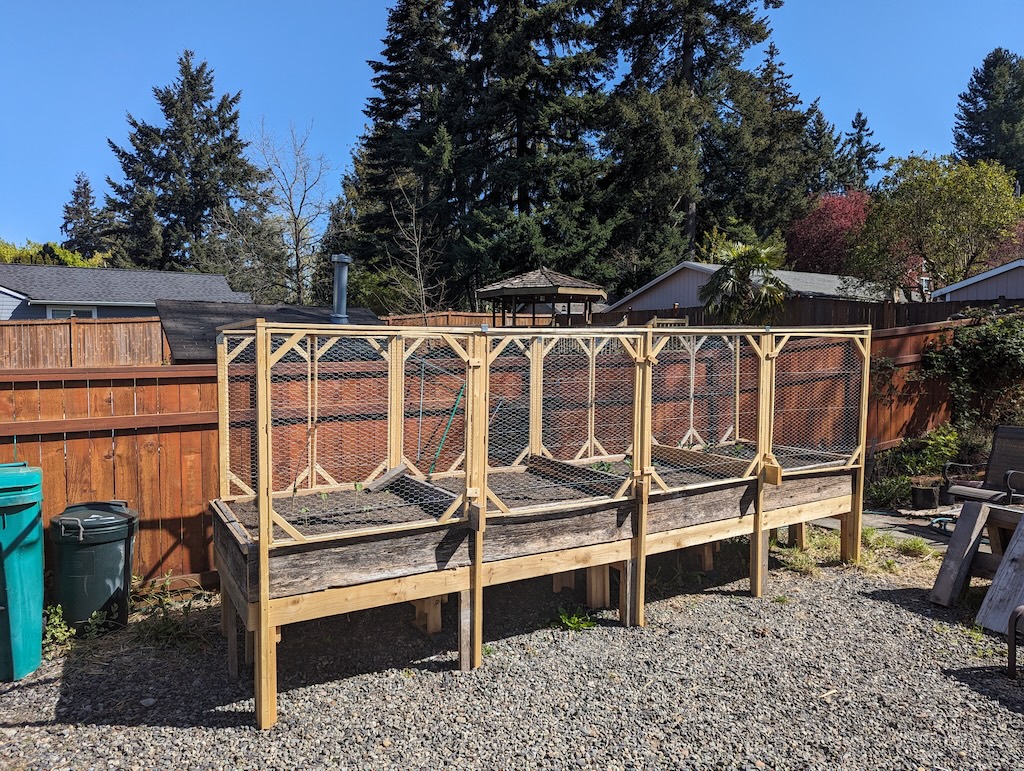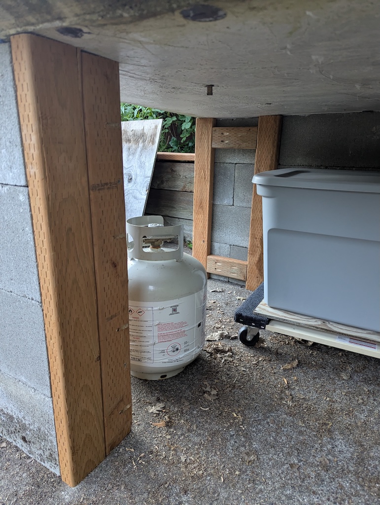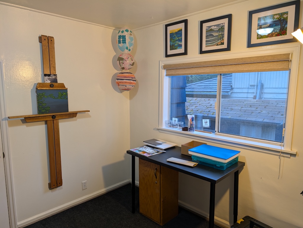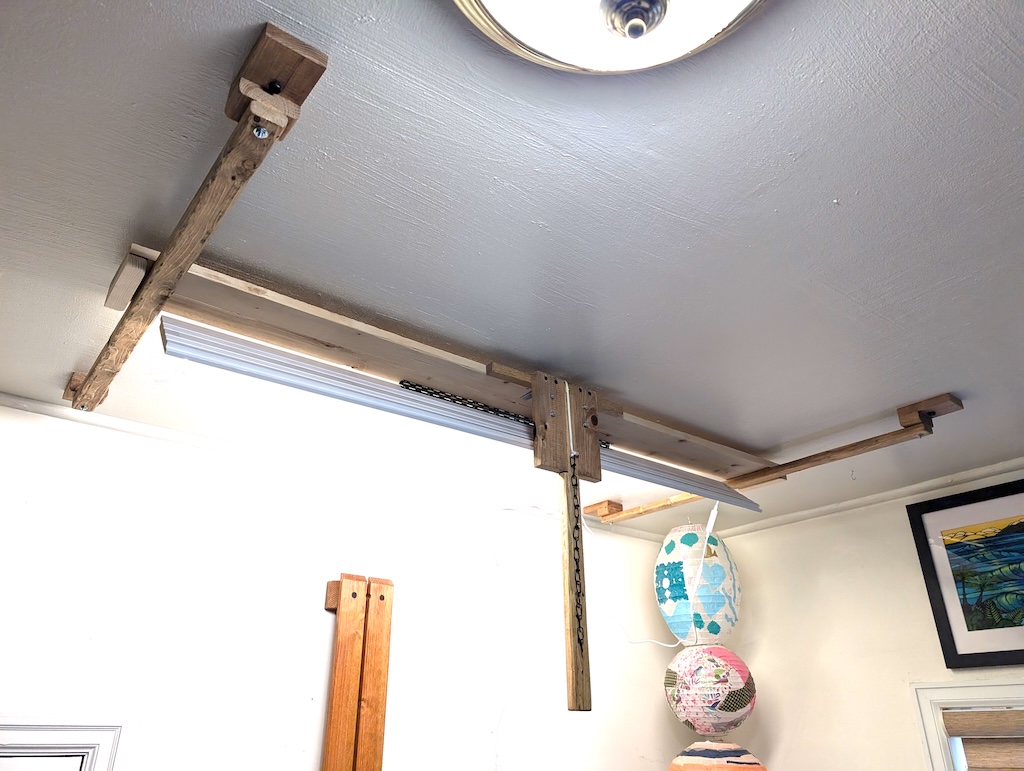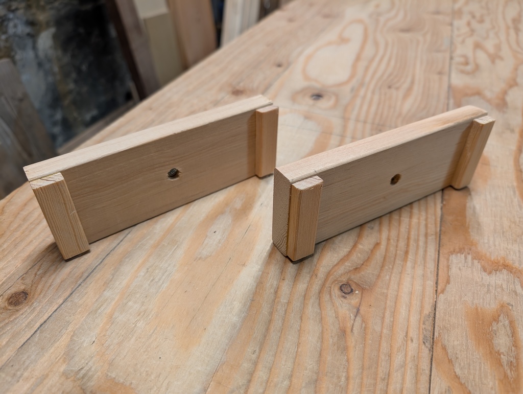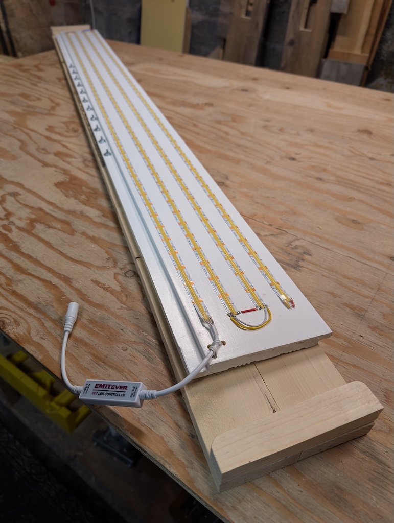 A lot of the items on this webpage started out on the Graphic Art page and then I split them out over here and grouped them with other "built" things. It's an imprecise distinction between things that are purely constructed and things that are an artistic endeavour. Art studio adjustable light fixturePainters want to avoid having the light source cast hand or brush shadows on the canvas, or reflect a glare into their eyes off the canvas. This light fixture, built around an LED light strip cut into four sections, enables me to move the light forward and backward, as well as adjust its tilt relative to the canvas. Brush holderPaint brushes are best dried horizontal and artists often use multiple brushes at once, so it is helpful to have a place to quickly store and retrieve them. Wall easelMost people are familiar with conventional painting easels, tripods or four-legged contraptions that hold a canvas in a vertical or tilted orientation at a desired height for a painter. However, when working on larger canvases in interior studios (as opposed to plein air painting outside), artists often rely on a wall easel, which rather than free-standing, is a rigid structure mounted on a wall. There are several variations on this theme, such as French cleats and such, but one of the most common designs replicates the most common plein air design of a vertical track with sliding horizontal ledges. That is the kind I built. Raised garden bed64-square foot (4'x16'), standing hight, raised garden bed, fully enclosed with chicken wire and bird netting. Second pizza ovenAfter selling the house with the previous pizza oven (also shown below on this page), I started building a second pizza oven at my next house. As of this writing, I have only built the stand and the hearth, essentially a concrete table. I currently use it as the work area for a propane pizza oven but I fully designed, and purchased materials and tools for, a new pizza oven. This one, if I ever build it, will be made of cast refractory concrete instead of individual bricks, but will function in exact the same way, wood-fired — although I have a notion of configuring it to pre-fire (warm up) with gas, switching to a wood fire when actually cooking. Or perhaps I'll never build it. Who knows? Walnut double-window sill with alder casingFor my bathroom remodel, I did a lot of finishing work myself, such as the window casing in my daughter's new bedroom. Walnut window sill with birdseye maple casingFor my bathroom remodel, I did a lot of finishing work myself, such as the window casing in the new nook of the master bedroom. Quartzite window sill with tile casingFor my bathroom remodel, I did a lot of finishing work myself, such as one of the windows in the bathroom. Ceiling beam mouldingFor my bathroom remodel, I did a lot of finishing work myself, such as the moulding on this new support beam that protrudes through the dining room ceiling. Door mouldingFor my bathroom remodel, I did a lot of finishing work myself, such as eight door mouldings (each side of four new doors), consisting of Douglas Fir cut with nifty miter angles along the top and attached with rustic looking square-drive black oxide screws. Bathroom vanitiesFor my bathroom remodel, I did a lot of finishing work myself. I chose to build two bathroom vanities from scratch rather than purchase stock vanities, partly to meet eccentric size preferences that couldn't be had off the shelf, partly to save money, partly to satisfy my picky aesthetics, which I found difficult to achieve shopping around, and partly just for fun. Outdoor workbenchI needed a place to potted plants before bringing them indoors or to do various yard work (mostly plants again, the occasional gutter repair, etc.) and I was tired of kneeling on the ground for such work, so I built this bad boy. I don't have a final photo, but I cut the top pieces to fit the frame before screwing them down. Three shed doorsWhen I bought my house, the shed had three doorways, but no doors at all. So I built some. Catio and window cat doorI built my cat a catio with a window cat door, to which I later attached an IMU-enabled microcontroller with wifi to data-collect the timings of his exits and reentries. A few years after building it, just after having the house roof replaced during the bathroom remodel, I used some leftover shingle to put a proper shingle roof over the cedar roof. I don't have a photo of that. I also don't have a photo of the electronics for detecting door events. Workbench #2When I sold my previous house, I left the workbench I built (see further below) in the basement and built a new one at my next house, shown here (with one of the shed doors under construction on top of the bench). Patinated copper sheet back plates for bedroom furnitureI added patinated copper sheet back plates to my Mexican solid wood bedroom furniture set. The pieces are attached with copper nails and the wrought iron handles were removed and then replaced after attaching the copper backing. Talavera stair risersI made the talavera stair risers for our house extension. Stair railingI built the stair railing for our house extension (the contractor put in the newel post but I made the top and bottom rails and the balusters). The balusters are 3/4" copper pipe with an accelerated patina. The pipe was left over from the deck railing balusters that had been removed for the extension. Etching and copper-dial mechanical watchesI built an electro-etching tool (little more than a power supply. Here are my initial experiments. My etching artwork has consisted of copper watch dials for my microbrand mechanical watches (Badlands Watches). Please visit the Badlands website to see more photos. Wood-fired brick pizza ovenThis project was such an enormous undertaking that it has its own webpage. Please go there to see the full history of the project, including numerous photos of the construction process. My ex-wife's engagement ring and our wedding bandsBoth 